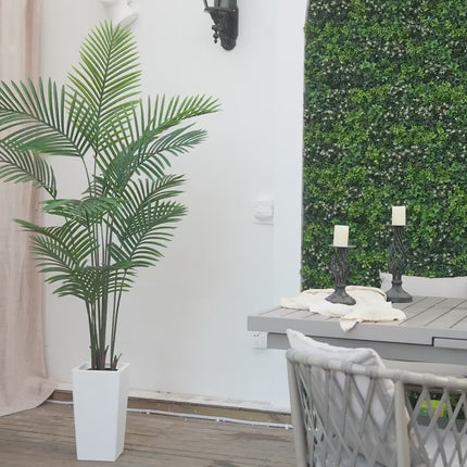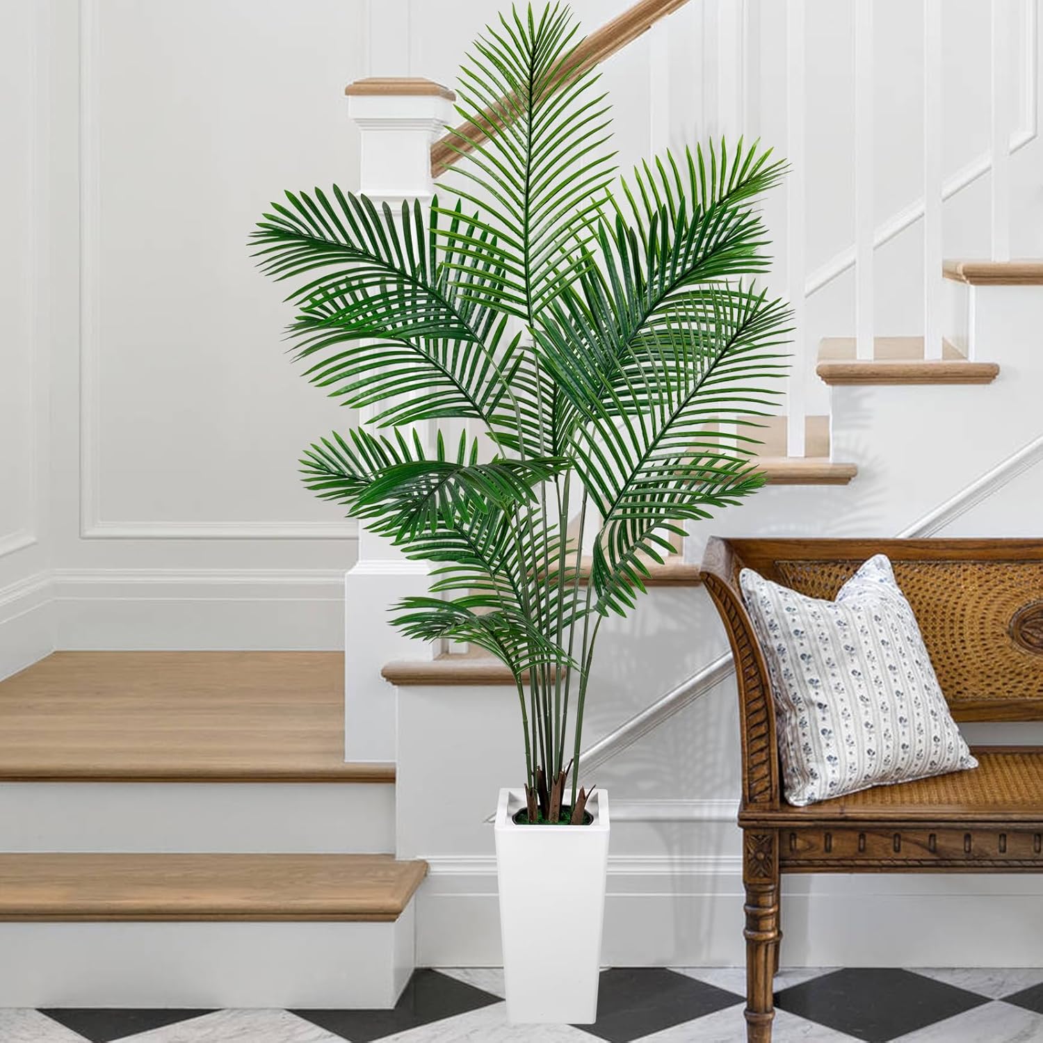 Add a touch of tropical elegance to any space with our lifelike Artificial Palm Tree. Standing tall in a 15.7-inch white removable square planter, this piece arrives ready to display—no extra pot needed. The sturdy base ensures stability, while the clean modern planter complements any décor style.